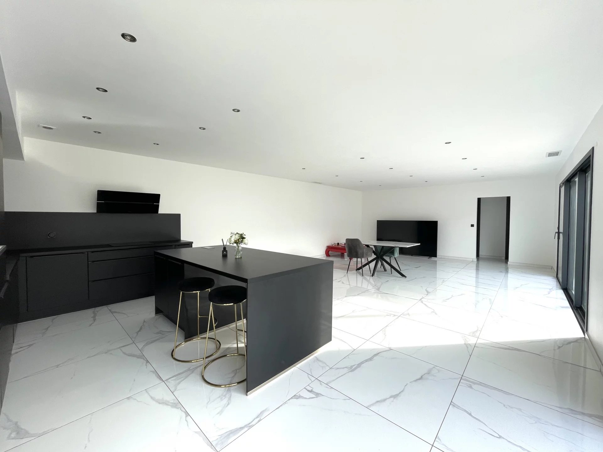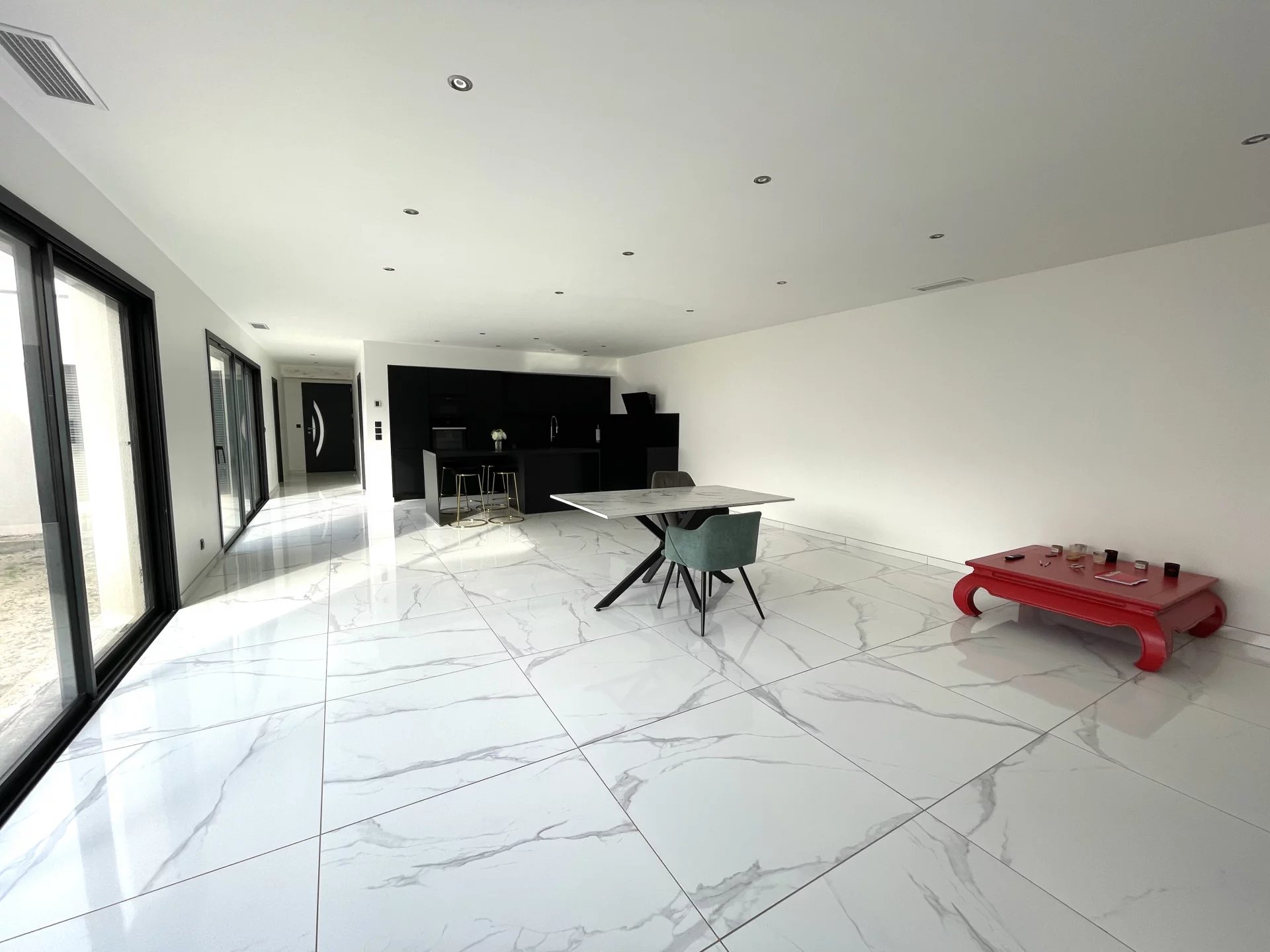 Climatisation gainable, carrelage grand format, volets roulants motorisés, grand garage carrelé, thermodynamique, wc suspendu, dressings,...