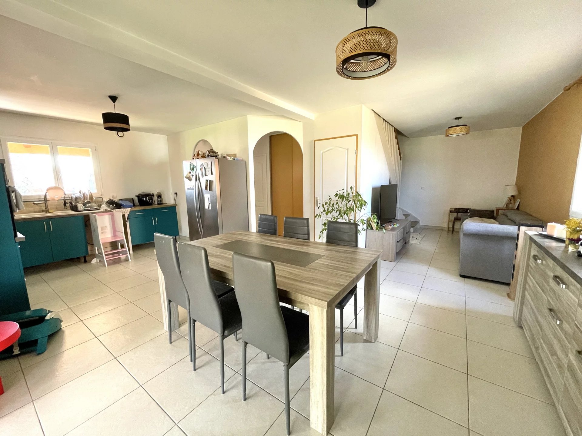 Elle est composée en rdc d'une entrée avec placard, une belle pièce de vie de 35m2 complétée par une veranda de près de 14m2, d'un wc et d'un garage carrelé.