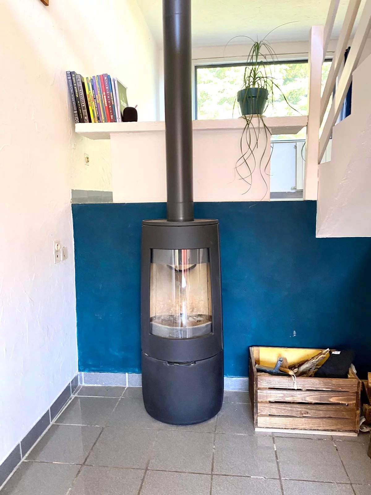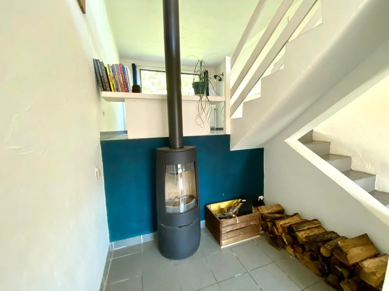Rez-de-chaussée : buanderie, salon avec cuisine ouverte donnant sur balcon-terrasse, poêle à bois (chauffage principal), chaudière gaz, 2 chambres, salle d’eau, WC.