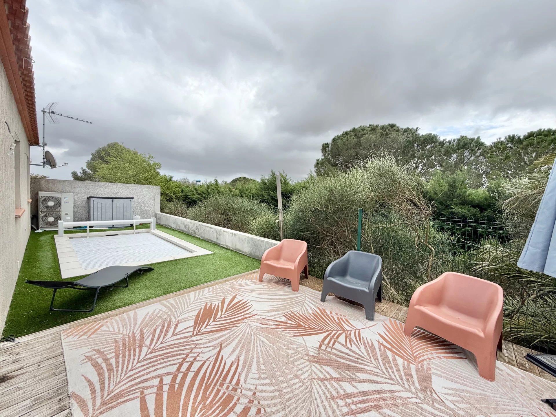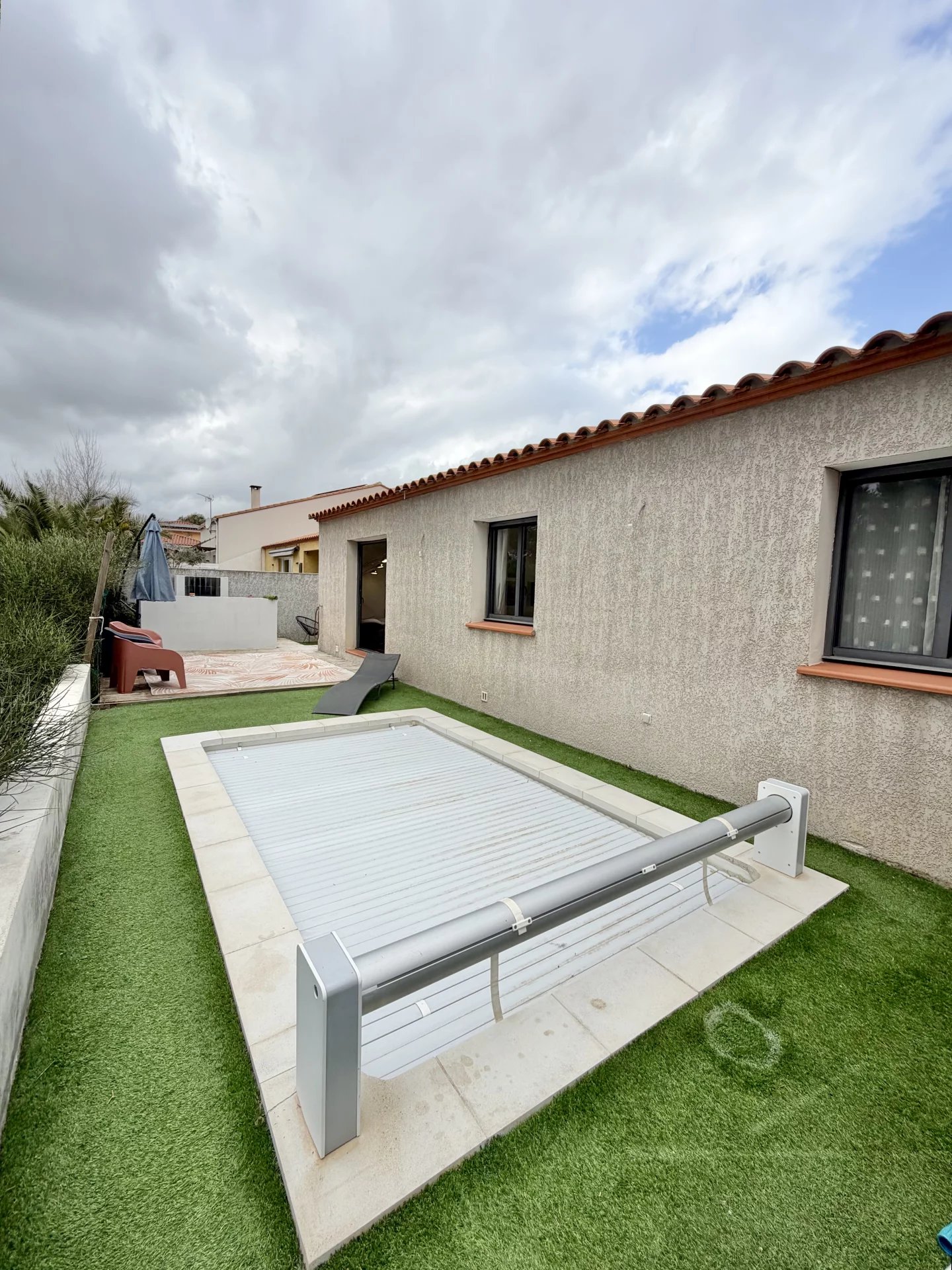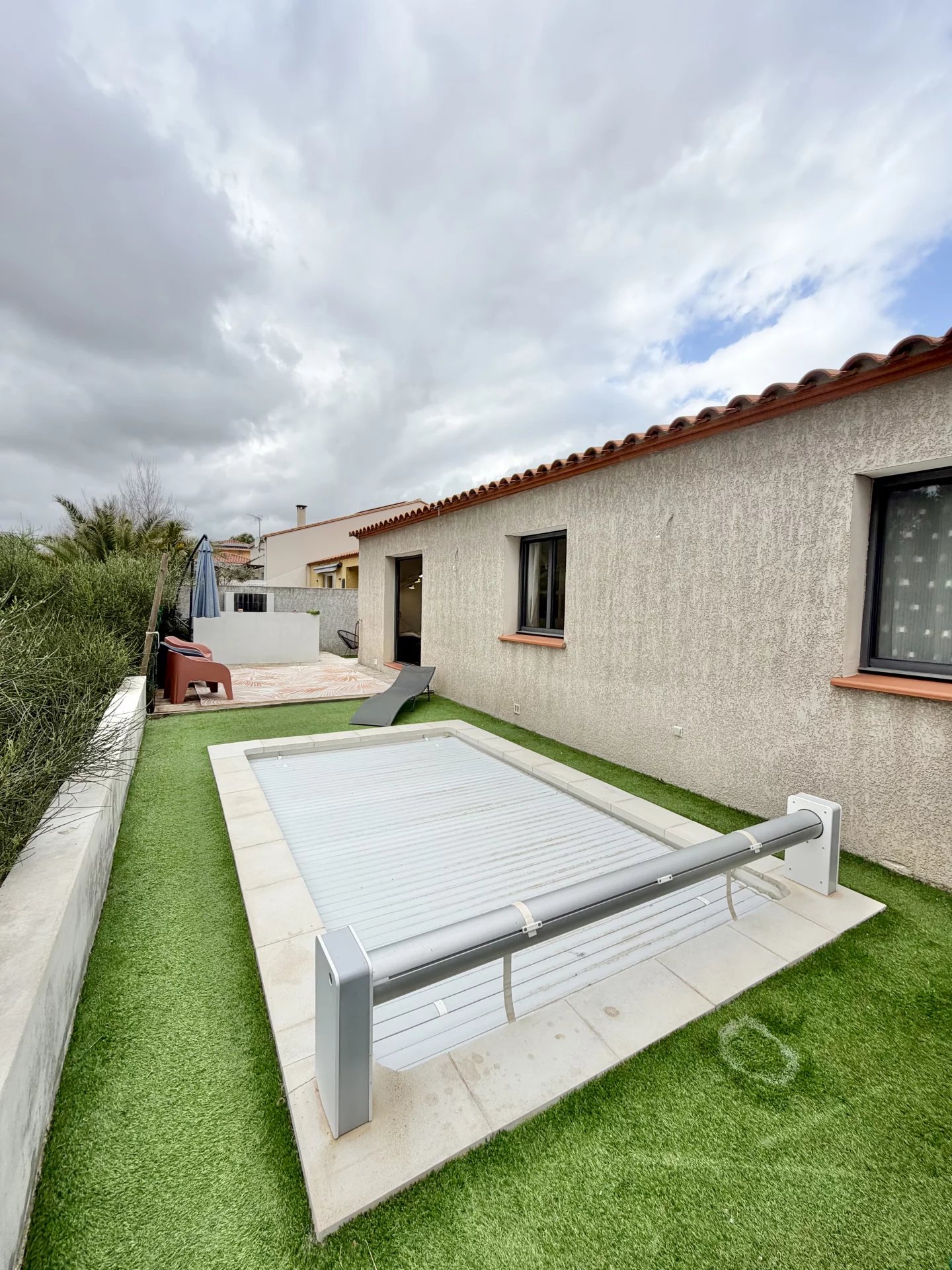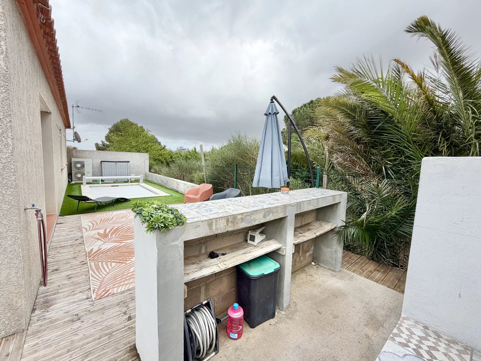 Vous bénéficiez de belles prestations : climatisation gainable, double vitrage, cuisine équipée, nombreux placards, jardin aménagé avec coin barbecue en dur, piscine sécurisée avec rideau et un abris jardin en dur. Jardin avec peu d’entretien.